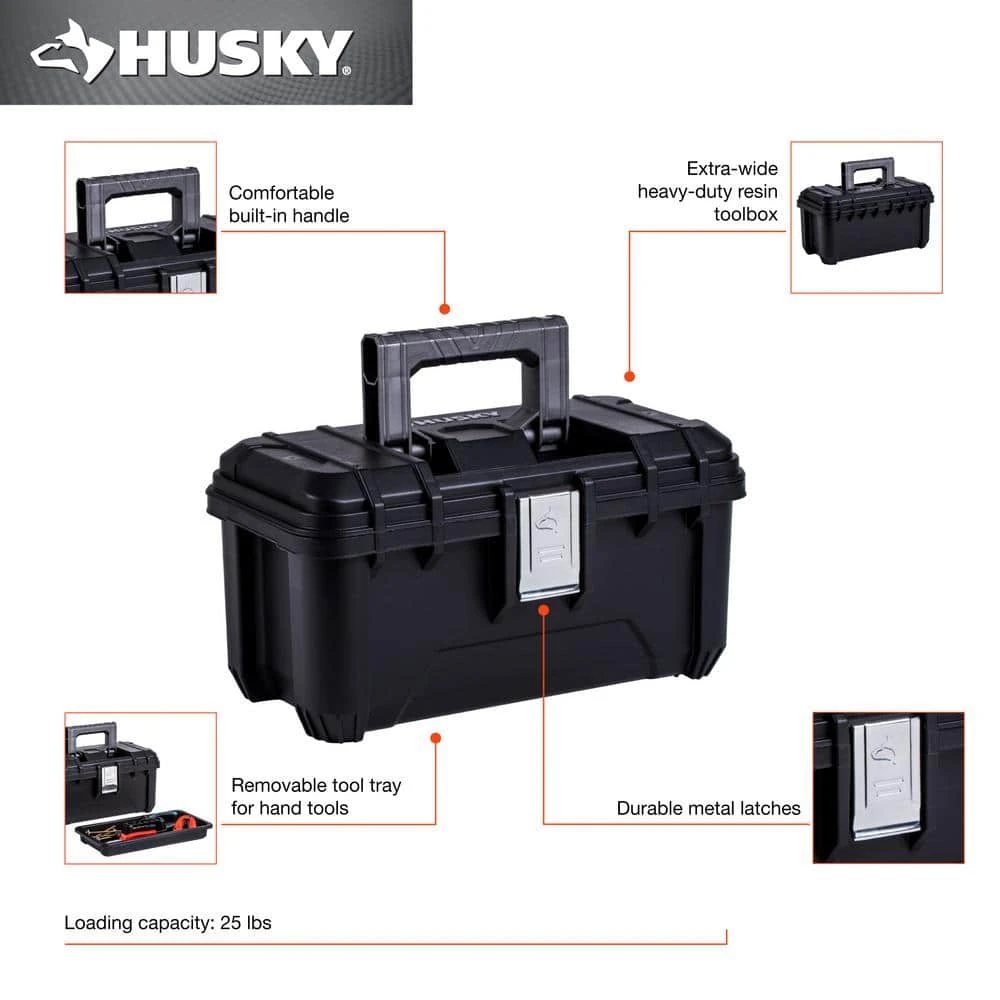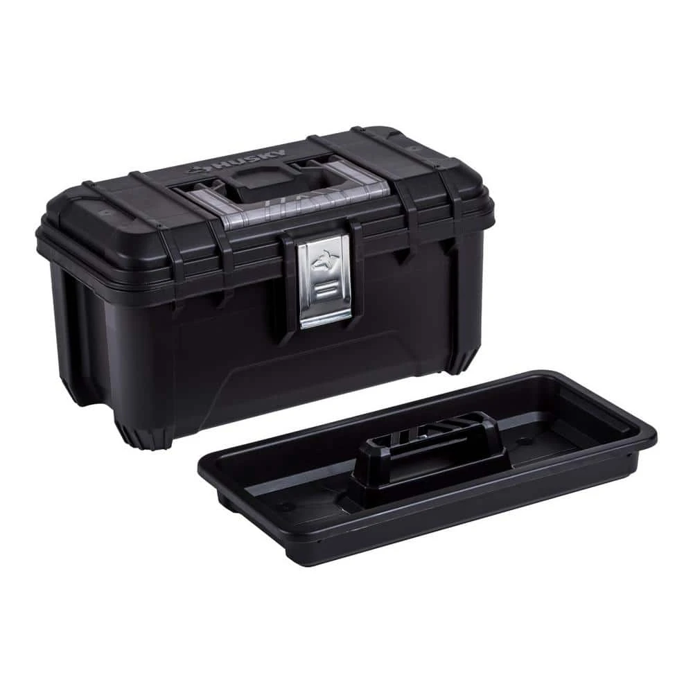 Husky Plastic Tool Box with large Metal Latch features a removable tool tray and durable heavy construction. At 16 in. it allows for ample tool storage with a comfortable carry handle. This tool box is stackable which helps with taking up space.