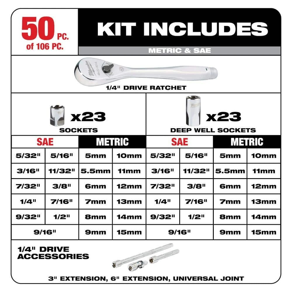 The Milwaukee PACKOUT 2-Wheel Cart has integrated PACKOUT mounting on the base and frame that allows users to securely stack or hang PACKOUT products. This PACKOUT rolling cart easily transfers on and off the jobsite with a 400 lbs. weight capacity and 10 in. industrial wheels. The PACKOUT tool storage system allows users to customize their storage solution for easy transportation and organization of tools and accessories. This Milwaukee Combo Kit features a 90-tooth ratchet tool that provides 4° of arc swing and a slim profile for work in tighter spaces. The included ratchet and socket set has FOUR FLAT Sides that prevent rolling and are wrench compatible. Sizes are stamped into each socket for easy-to-read visibility. Users can keep both the SAE and Metric 56-piece. and 50-piece 1/4 in. Drive Ratchet and Socket Sets organized in the included PACKOUT Compact Low-Profile Organizer with a clear top for easy identification of parts at a glance. This PACKOUT Organizer is IP65 rated and built from impact-resistant materials. The Low-Profile Organizer is part of the Milwaukee PACKOUT Modular Storage System, allowing users to custom build storage systems to easily transport and organize their tools and accessories. This kit includes 106 total pieces: a 56-Piece 3/8 in. Drive Ratchet and Socket Set (48-22-9008), a 50-Piece 1/4 in. Drive Ratchet and Socket Set (48-22-9004), and a PACKOUT Low-Profile Organizer (48-22-8431).